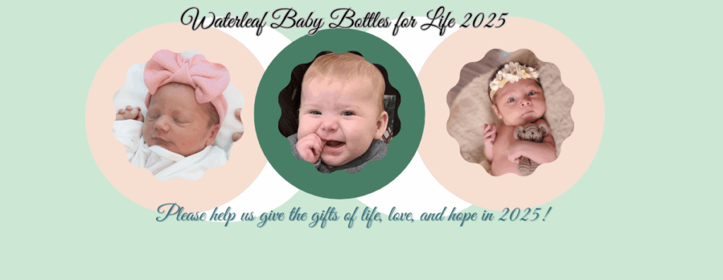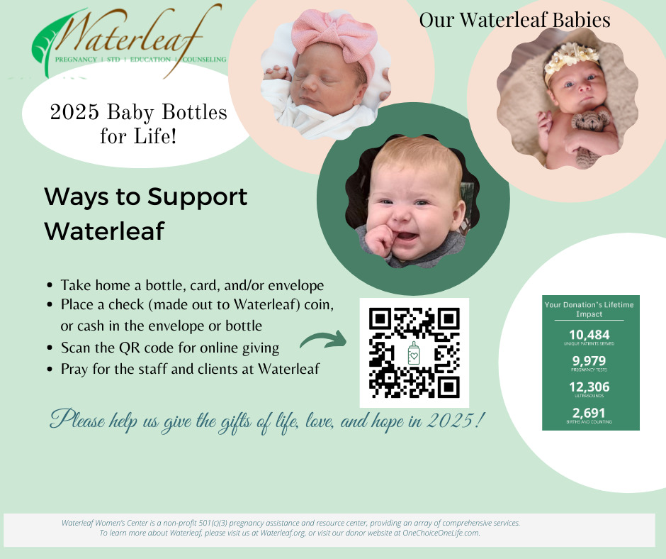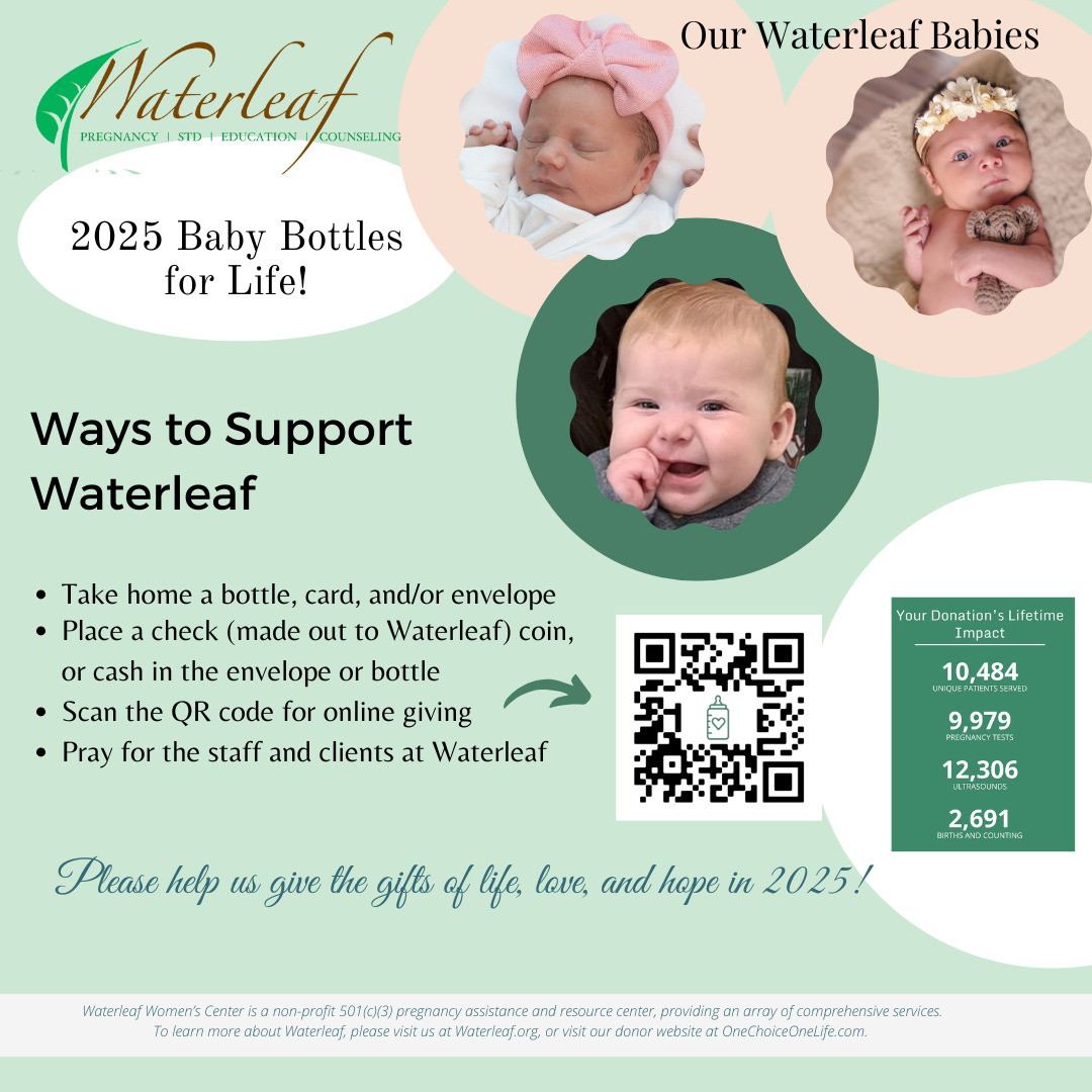 Every dollar given through the Baby Bottle for Life Fundraiser equips Waterleaf to serve women, men, and families in our local communities. Your donations help us give physical, emotional, and spiritual support to young men and women as they face pregnancy-related situations and circumstances.